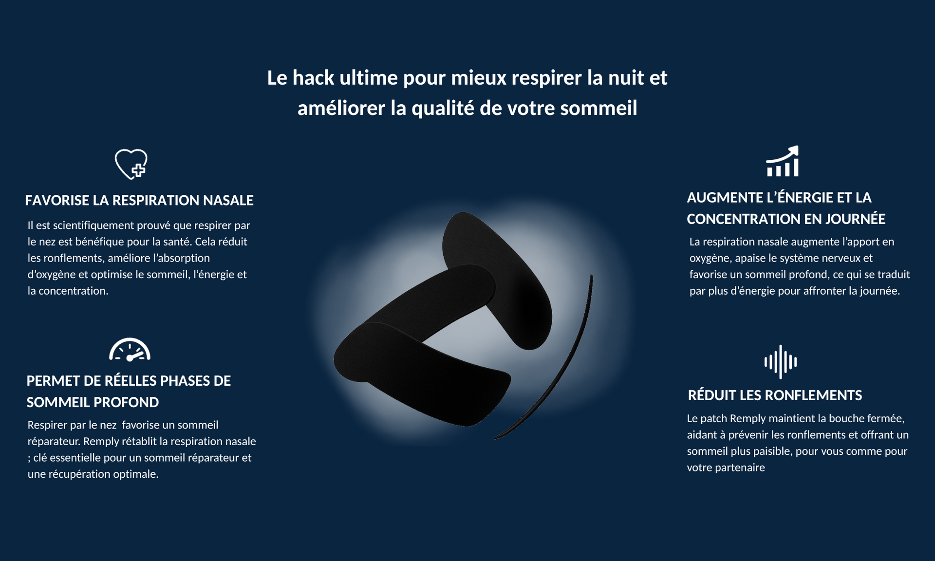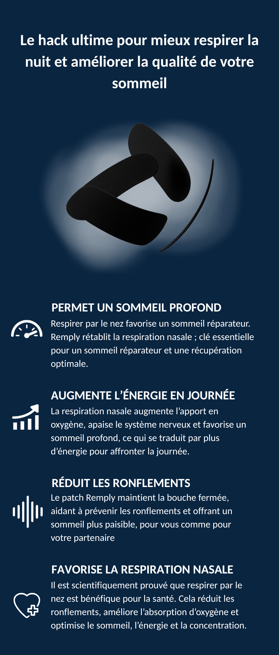 Les patch Remply aident à réduire les ronflements liés à la respiration buccale. Pour les cas d’apnée du sommeil ou ronflements sévères, il est conseillé de consulter un professionnel de santé.
